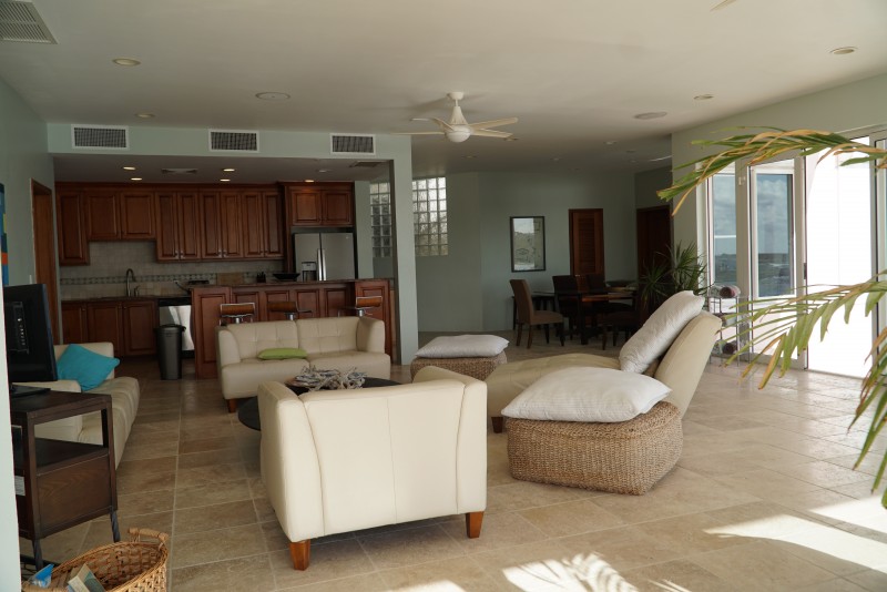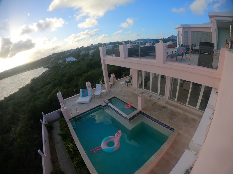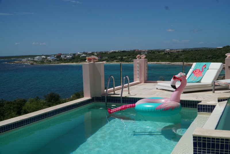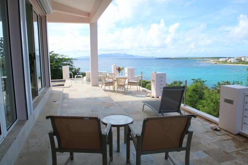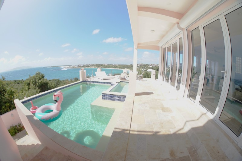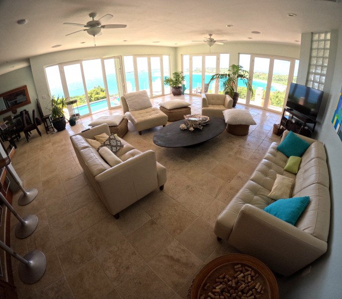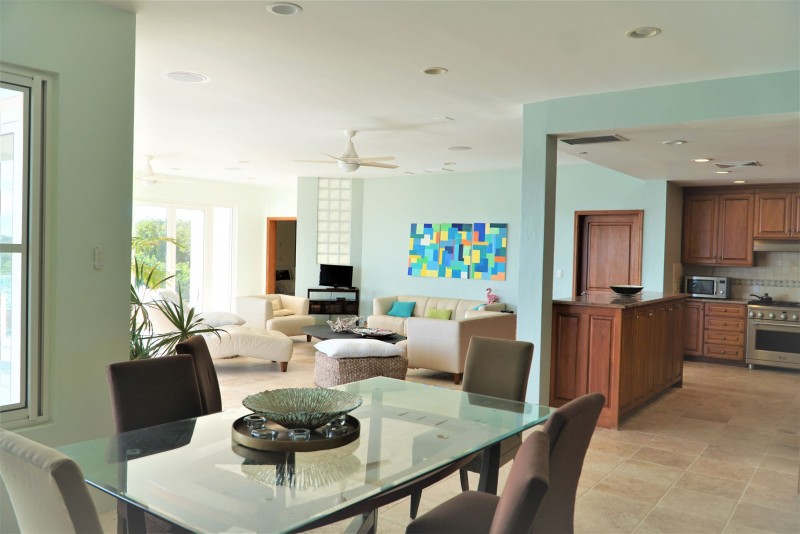The main level features an inviting open layout surrounded by glass doors presenting expansive views of the sea, St Martin, St Barth and Anguilla to be seen day and night.